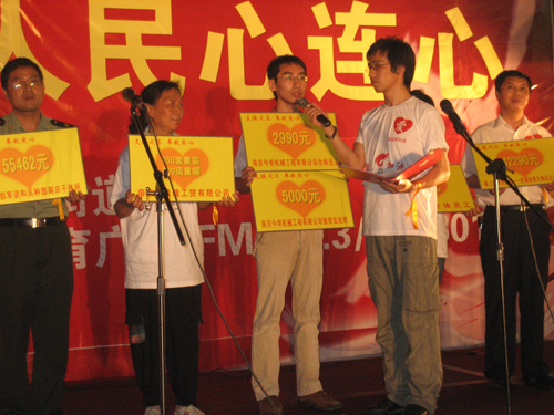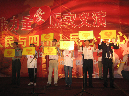 晚19點整,天空下起了陣雨,主持人曉龍宣布全體起立向在四川大地震中遇難同胞默哀1分鐘。晚會在鎖金五村社區一曲《愛的奉獻》中拉開了序幕,隨后,社區居委會、轄區企事業單位、南京體育廣播的全體主持人演出了自編自演的詩朗誦、歌伴舞等節目,生動感人,催人淚下;正在災區奮勇抗災的成都軍區某部列兵王羽歆的母親現場表達了社區居民對抗災軍民的問候與祝愿;殘奧會冠軍、奧運火炬手白萬里等專程趕到現場參加募捐,臺上臺下互動聲此起彼伏“四川加油!中國加油!”。